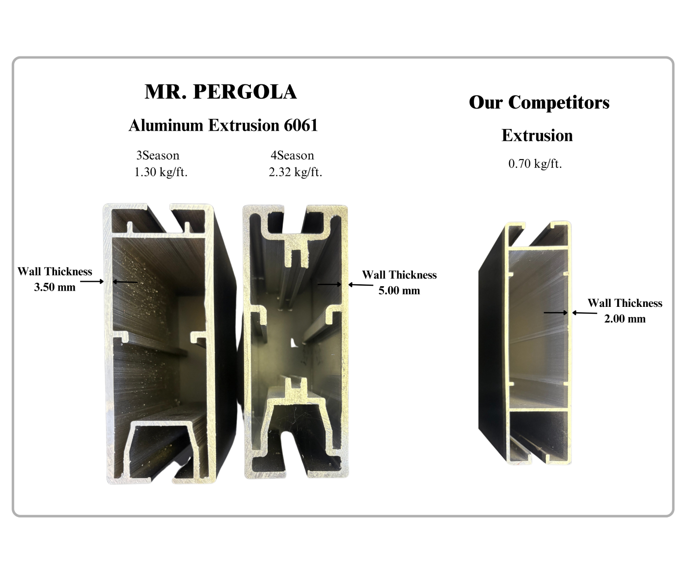 Mr. Pergola is made of extruded metal resistant to wear and tear: Aluminum 6063-T6 for louvres and Aluminum 66081-T6 for columns. The structure can withstand up to 18-24 inches of snow weighing up to 60lbs/sq foot.